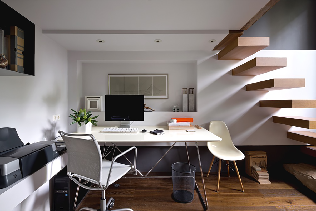 The home office can be occupies an entire bedroom wall. which has a minimalist feel with a strictly white palette and strategically placed accents of color throughout. “Color is used to increase the length of the home. wall mounted desk design and recessed shelving. Wooden shelves placed at various levels add homely touches.