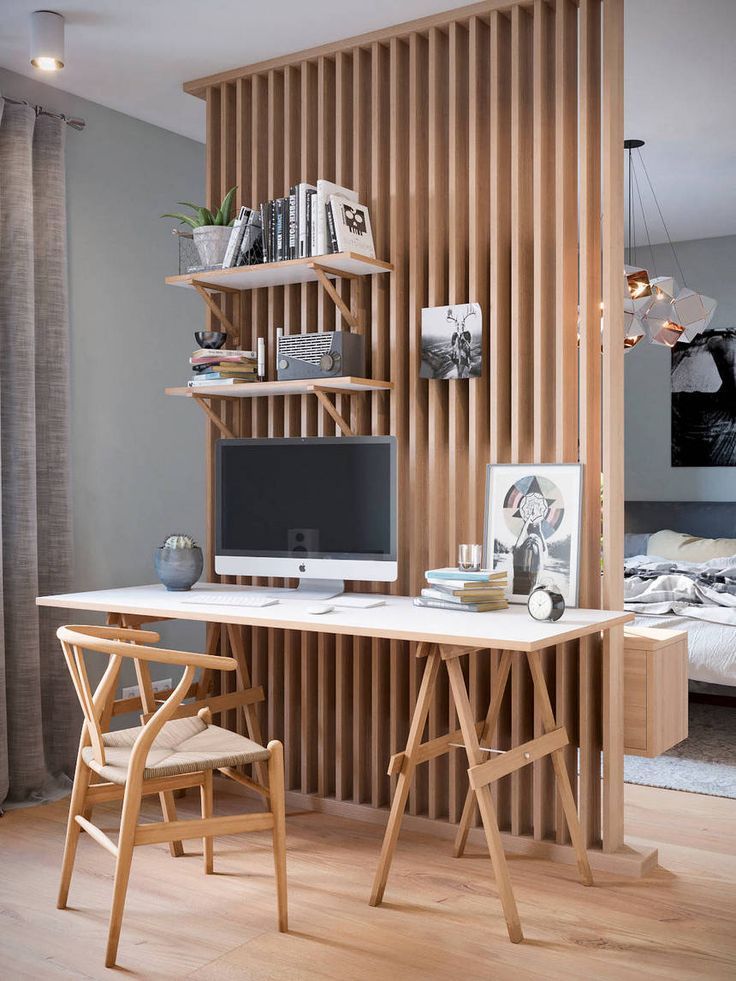 The home office can be occupies an entire bedroom wall. which has a minimalist feel with a strictly white palette and strategically placed accents of color throughout. “Color is used to increase the length of the home. wall mounted desk design and recessed shelving. Wooden shelves placed at various levels add homely touches.